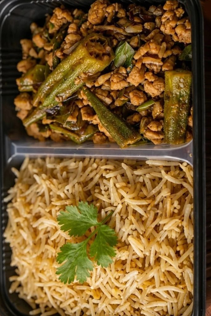 المكونات: بامية خضراء طازجة، بروتين صويا عالي الجودة، أرز بسمتي طويل الحبة، وصلصة طماطم مسبكة بالثوم والكزبرة.