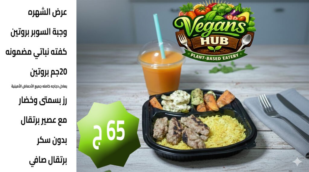 “فيجانز هب (Vegans Hub) هو مطعم عصري يعتمد على النباتات، أُسِّس خصيصاً للأشخاص الذين يثمنون الحياة الصحية، والاختيارات الأخلاقية، والنكهات القوية الجريئة.”